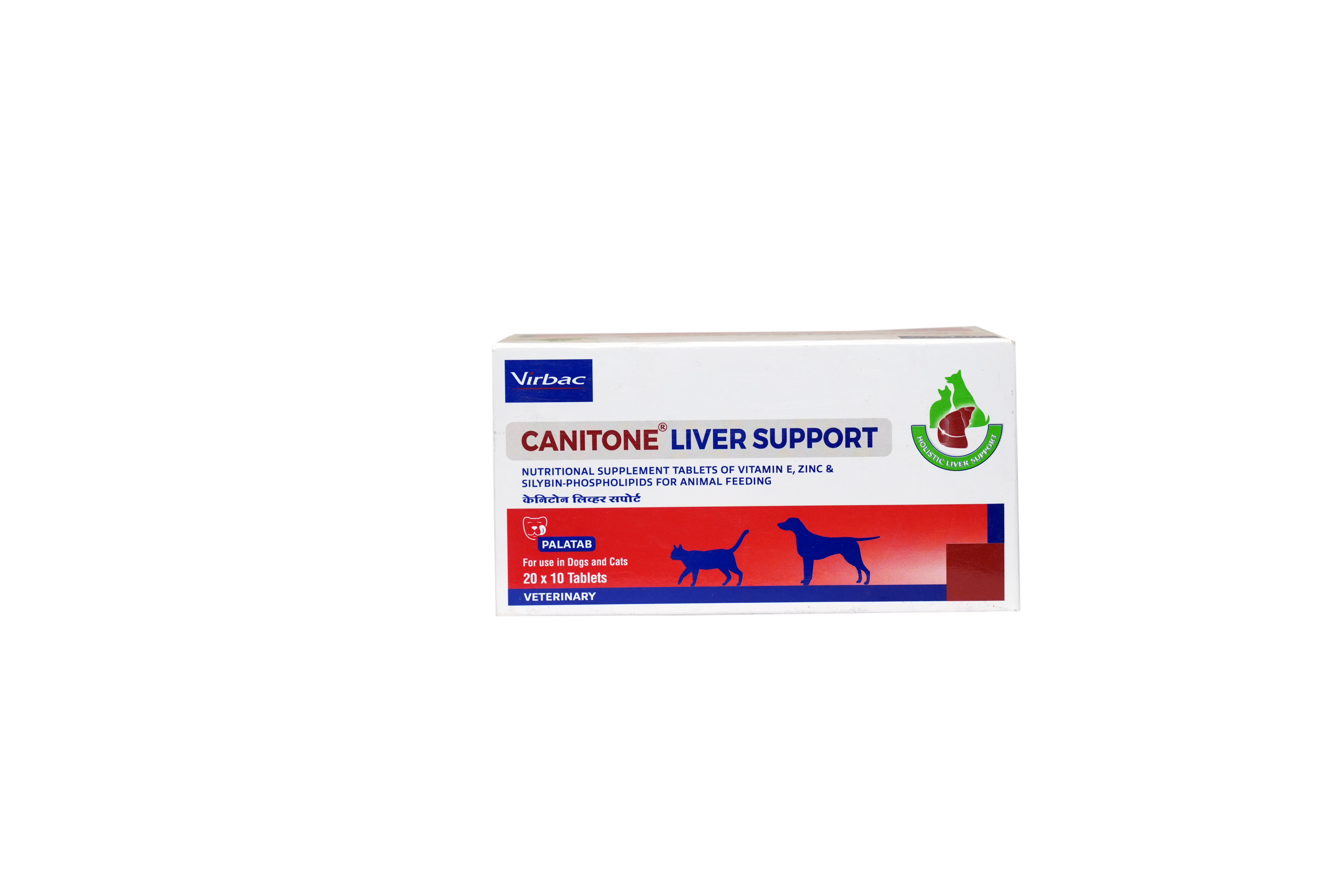 CANITONE LIVER SUPPORT is a holistic creation of Silybin-PC, zinc, and vitamin E to support liver health in a palatable tablet form. Composition: Silybin-PC 100 mg (Equivalent to Silybin 33mg) Zinc 3.3 mg Vitamin E 150 IU Class: Liver Supplement Indications/Uses Canitone Liver Support helps support the best liver function and maintains liver health. It reduces the absorption of toxins that the pet may be exposed to Directions for use: As directed by the Veterinarian Disclaimer This product is a nutritional supplement for pets and is not intended to diagnose, treat, cure, or prevent any disease. Use only under the guidance of a qualified veterinarian. Always follow the recommended dosage.
